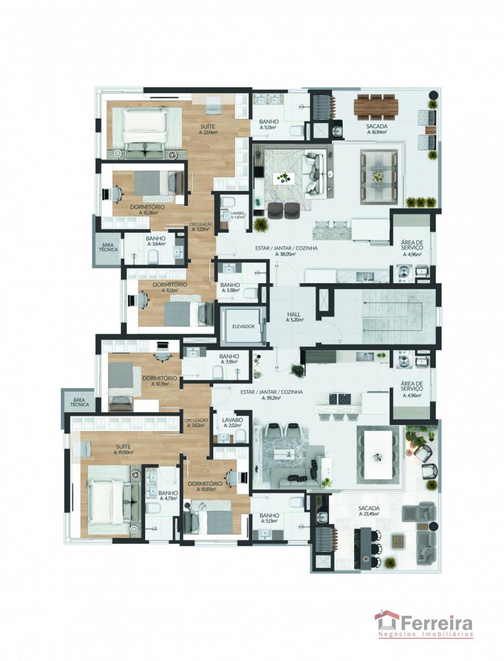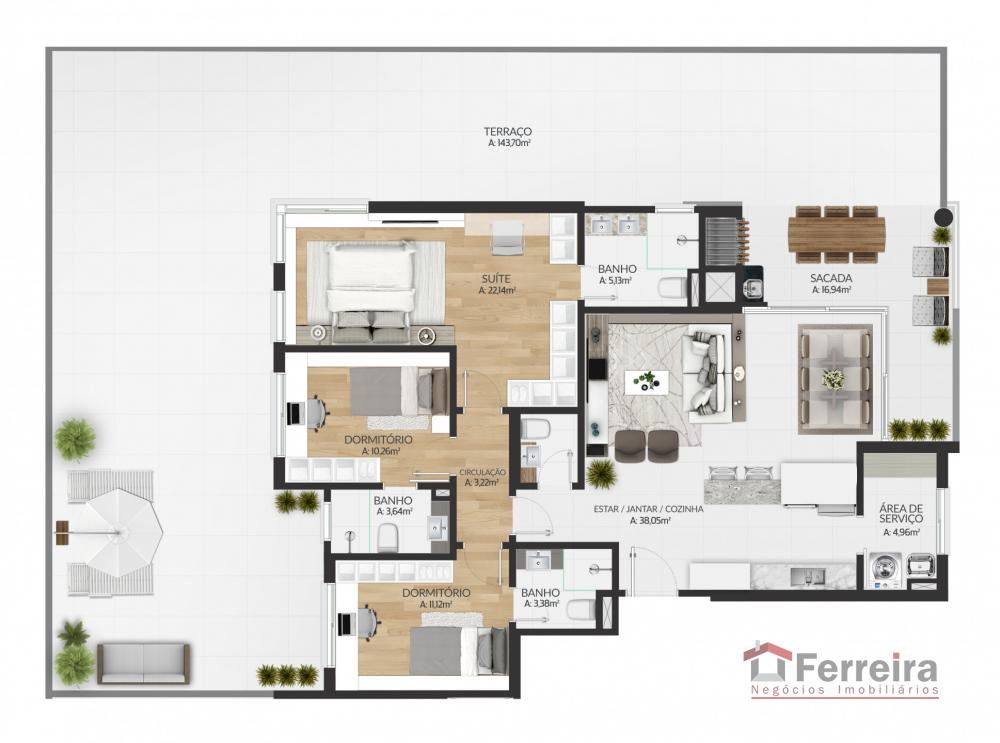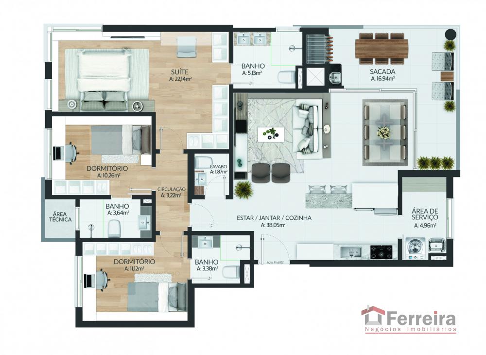 Finos detalhes fazem diferen莽a, conta com 03 dormit贸rios com su铆te, banheiro social, cozinha, 谩rea de servi莽o, sacada, sala de estar, sala de jantar, 03 box de garagem, elevador, sal茫o de festas, brinquedoteca, academia, hal de entrada.